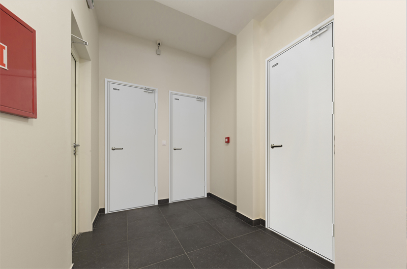 Các cửa của lối ra thoát nạn từ các hành lang tầng, không gian chung, phòng chờ, sảnh và buồng thang bộ phải không có chốt khóa để có thể mở được cửa tự do từ bên trong mà không cần chìa khóa. Trong các nhà chiều cao lớn hơn 15 mét, các cánh cửa nói trên, ngoại trừ các cửa của căn hộ, phải là cửa đặc hoặc với kính cường lực.